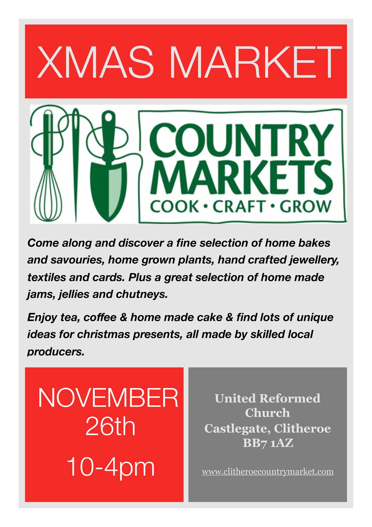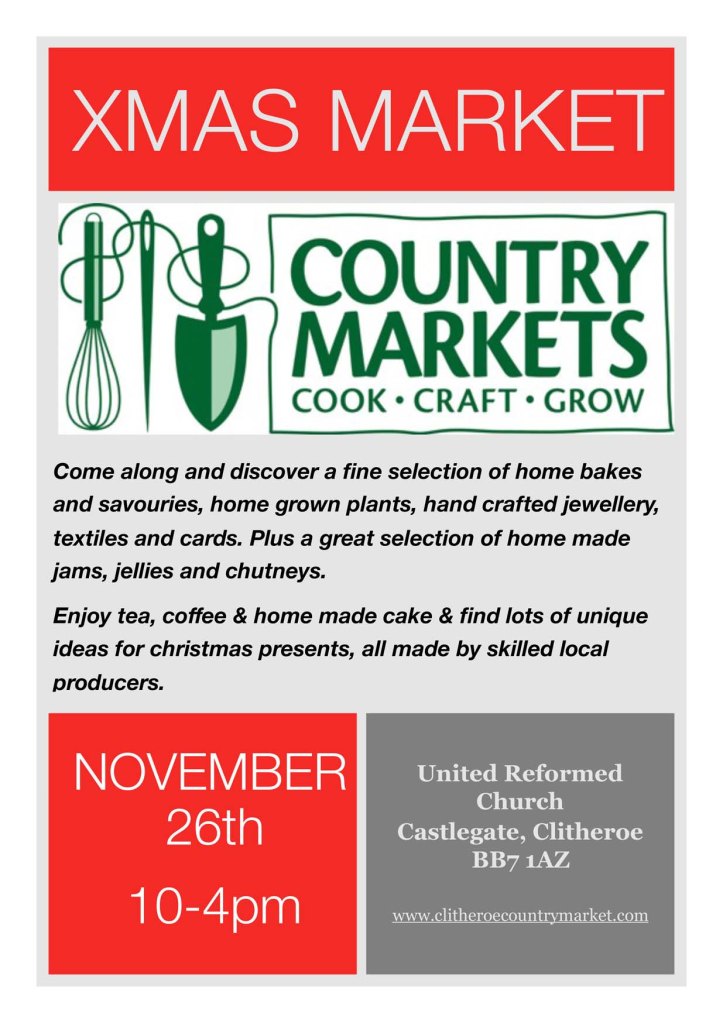 November 26th is the date for our annual Xmas Saturday Market 10am til 4pm. Country Market members are busy taking orders for special, home baked Christmas cakes and creating crafty stocking fillers. There will be an array of seasonal baking and home made preserves, hand crafted present ideas – textiles, knits, prints and jewellery as well as a fantastic range of original winter cards. We love the chance of a Saturday market as we get to meet customers who can’t manage to make our regular Tuesday mornings. So spread the word and come and join us – there will be the usual tea, coffee and homemade cake along with some light lunch options and a warm welcome. Free admission and disabled access.