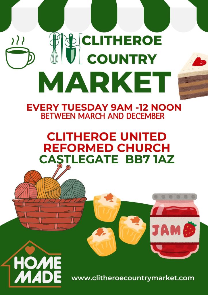 Important dates · Market news Clitheroe Country Market every Tuesday morning 9 -12 noon March 9, 2026 Clitheroe Country Market March 10th – December 8th 2026 at Clitheroe United Reformed Church, Castlegate, Clitheroe BB7 1AZ Share this: Share on X (Opens in new window) X Share on Facebook (Opens in new window) Facebook Share on Pinterest (Opens in new window) Pinterest Email a link to a friend (Opens in new window) Email Like Loading... Share this: Share on X (Opens in new window) X Share on Facebook (Opens in new window) Facebook Share on Pinterest (Opens in new window) Pinterest Email a link to a friend (Opens in new window) Email Like Loading...
